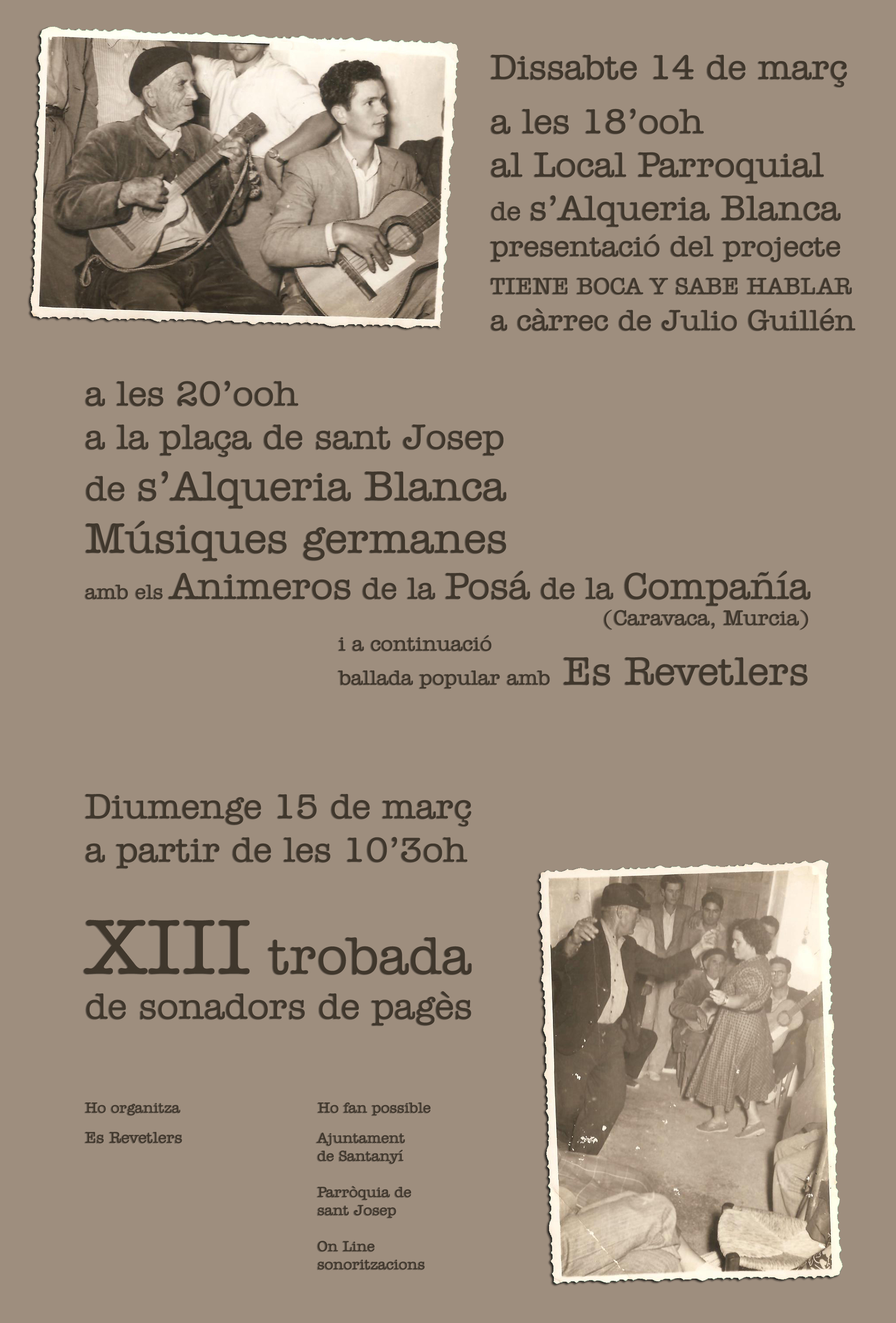 Som fills de casa de sonadors i cantadors, de gent balladora i lligada a la festa. Arran del nostre bres sempre hi ha hagut una guiterra, una ximbomba o unes mamballetes marcant els passos del ball nostrat. Hem vetlat els peus a bons balladors i hem après les passes d'una mateixa ben espolsada, o de les cotes, la polissonada d'una al·lota que mira d'enganar un bergant. Som hereus d'uns sons i unes tonades que de cada dia pareix que mancaben encara més, però que de cap manera consentirem que es perdin. Som joves i compromesos amb uns batuts que, de molts anys enrere, s'han sentit ben vitencs per la nostra contrada. No renegam però de les noves músiques i sonoritats, com les creacions noves que hem fet, però volem conservar, i per molt de temps, l'antic ball de pagès que encara ara conserva, com un gelós tresor, el matriarcat de les cultures mediterrànies antigues.